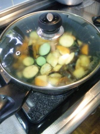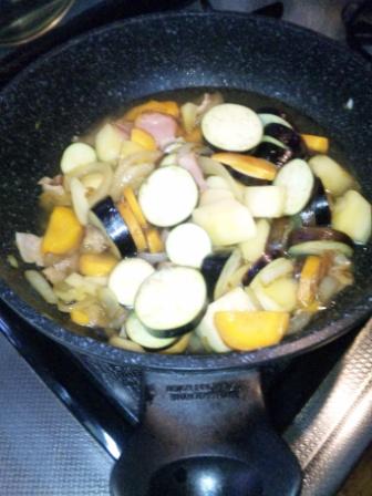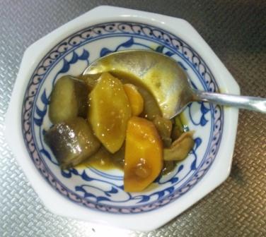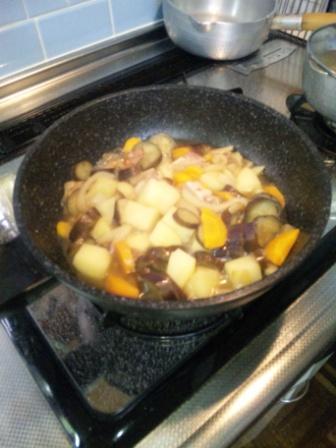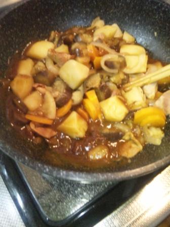 少し炒めて 水を加えて 400CCでは少ないようだが このまま、蓋をして 待つこと 15分 いったん火を止めて カレーのルーは、どれでも甘口購入 3かけ 入れたところで 水分が無くなったみたいに^^; お湯で100CC追加 とルー1かけ追加 10分ほど煮込んで味見 これで OK